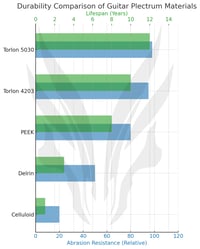 Hypothetically, comparing the abrasion resistance and lifespan of innovative materials like Torlon and PEEK to traditional ones such as Celluloid and Delrin reveals stark differences. Engineered for intense wear, Torlon and PEEK significantly outlast standard materials, offering musicians a durable alternative that withstand extensive, rigorous use: